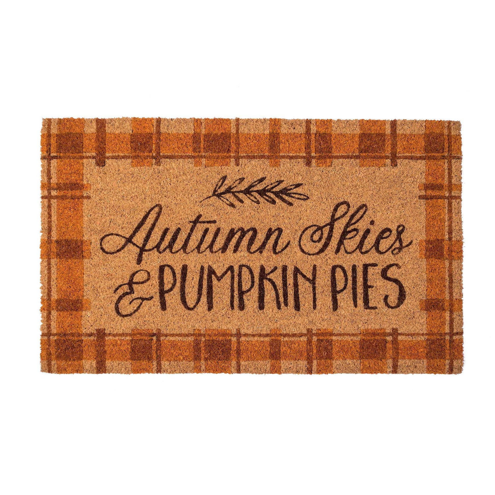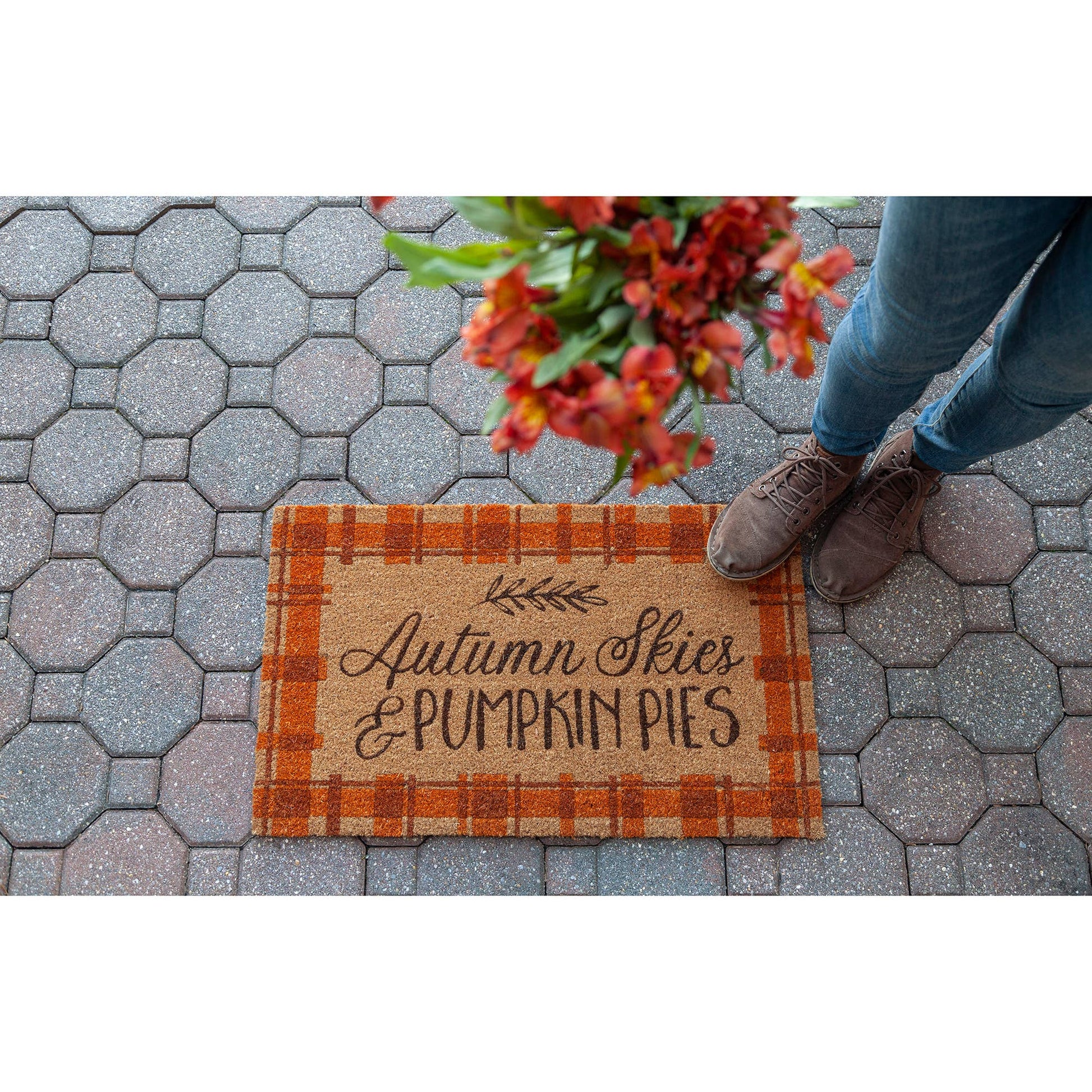 Congenial script invoking two of the harvest season's most welcome sights –– autumn skies and pumpkin pies –– is surrounded by a plaid border. This Entryways Sweet Home Collection doormat measures 17" by 28" and is 1/2" thick. It's crafted from the highest quality all-natural coir and hand-stenciled with eco-friendly dyes for long-lasting vibrance. This mat also has a PVC backing. Coconut fiber (coir) is natural, biodegradable, and an excellent dirt-trapper known for its scraping abilities.