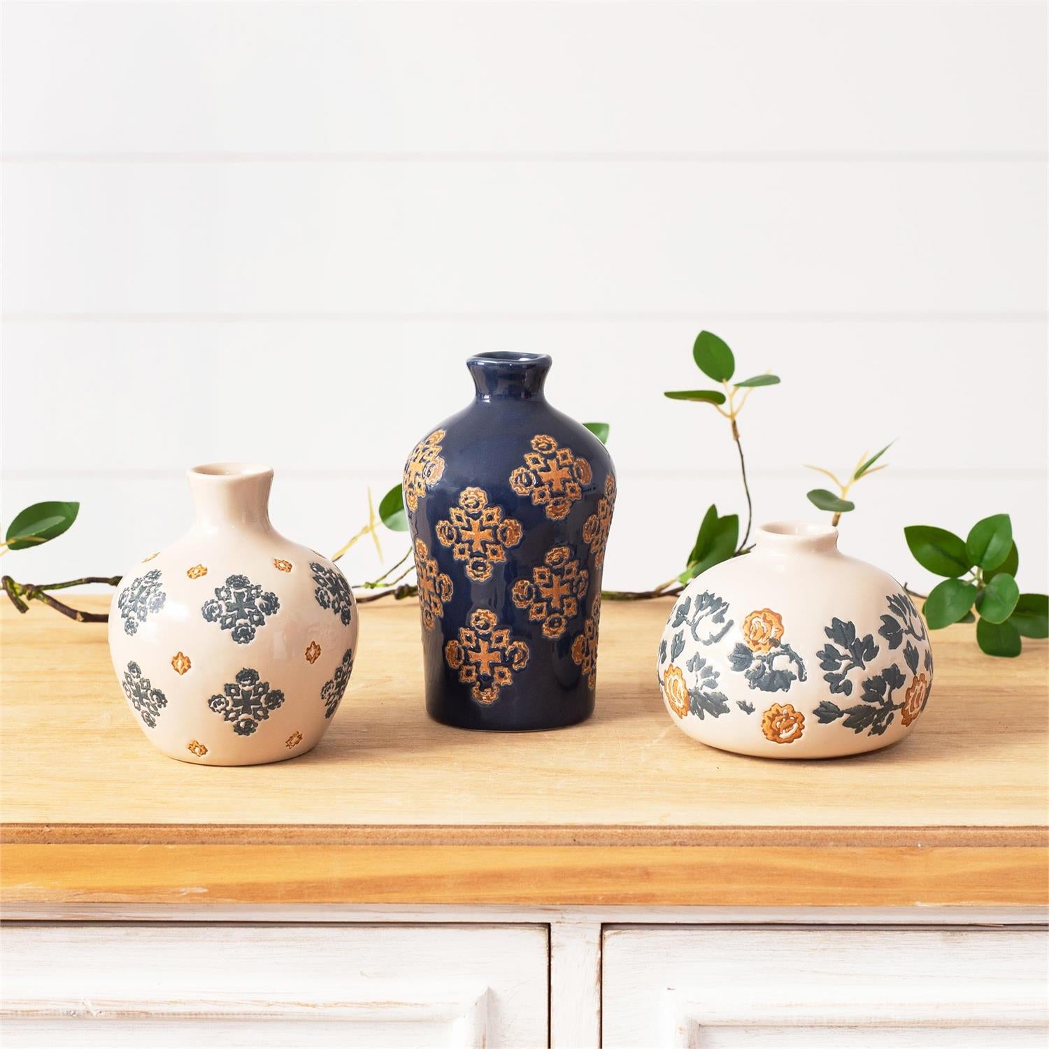 Add a splash of charm with these playful Blue Floral Motif Vases! Each small vase features delicate floral designs—two in creamy hues and one in a vibrant blue—sold separately. Perfect for brightening up your tabletop or adding a cheerful touch to any shelf, these adorable vases bring just the right pop of color and personality to your space. Mix and match to create your own whimsical display!