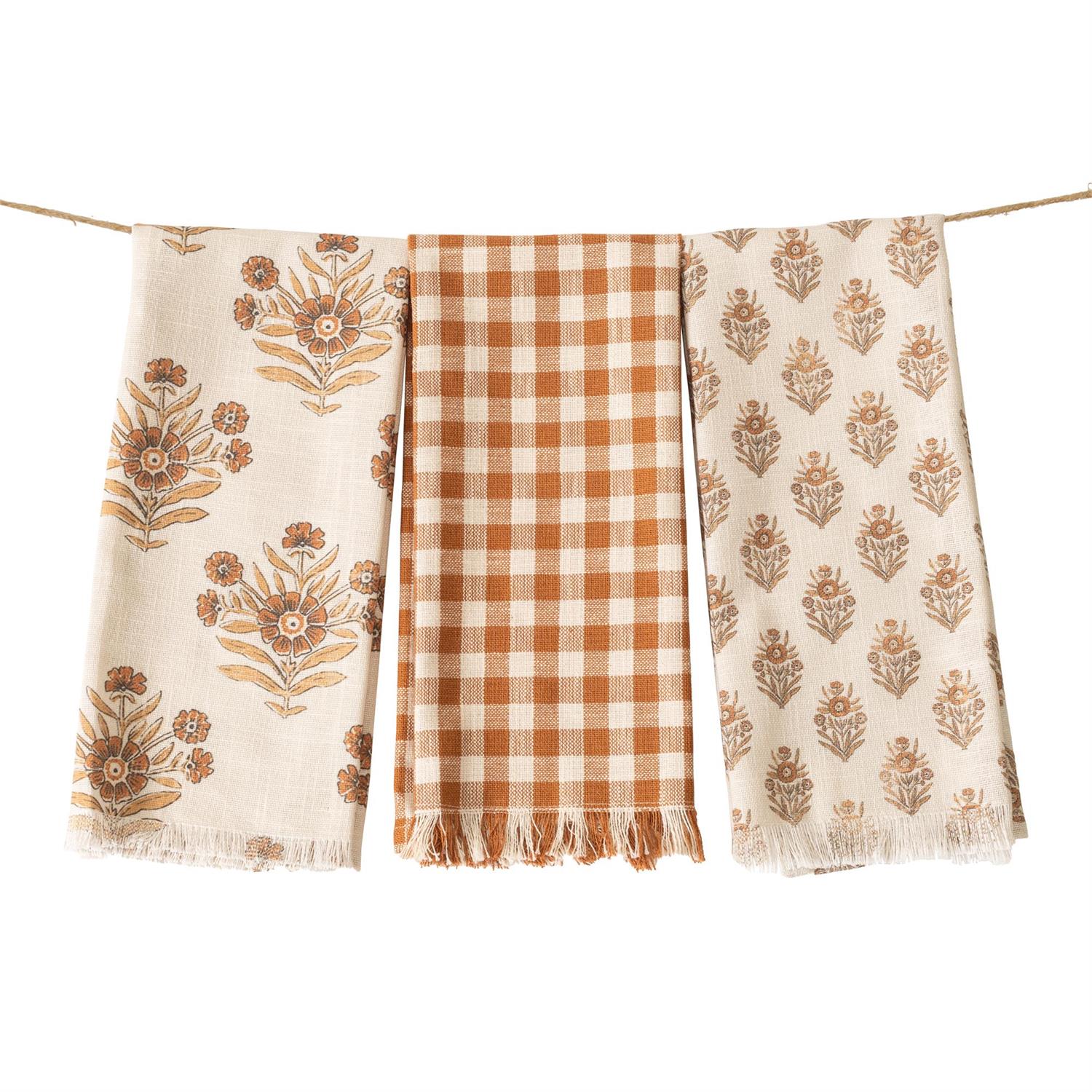 Brighten up your kitchen with our playful Fall Tea Towels, sold separately to mix and match your favorite styles. Choose the cozy orange and cream checkered towel for a classic touch, the bold large floral block print to make a statement, or the charming small floral block print for a delicate finish. Each towel brings its own splash of autumn cheer and practical charm to your daily routine.